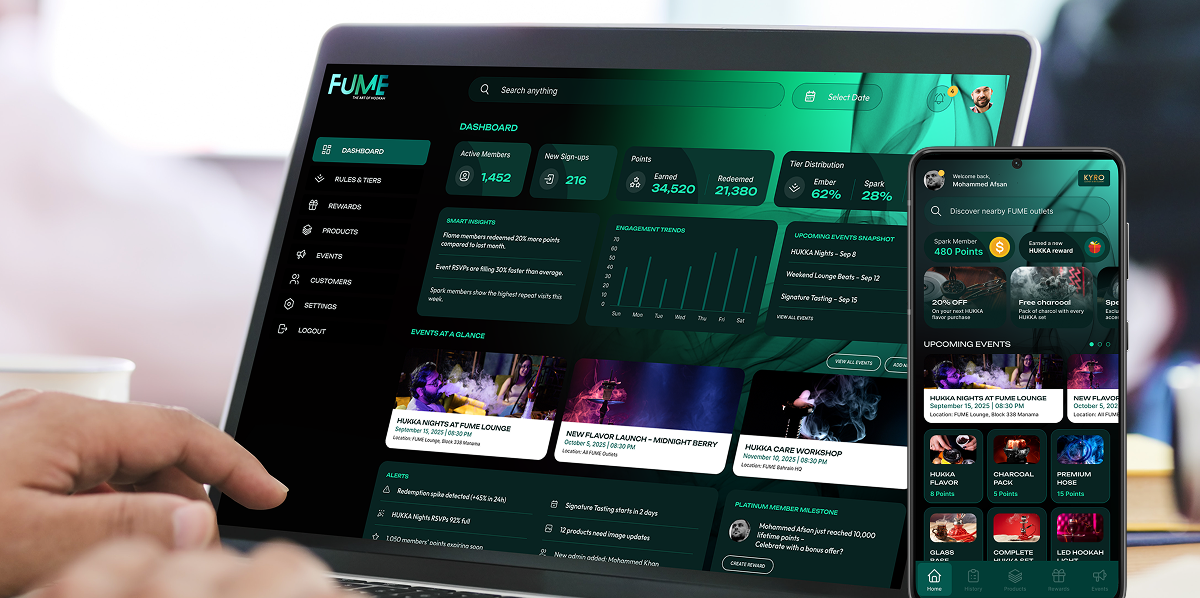 Developed as a sub-brand of Kyro, FUME blends tradition with technology offering a curated, customizable, and on-demand shisha experience via mobile. FUME gives you the power to craft your perfect session all from your phone.